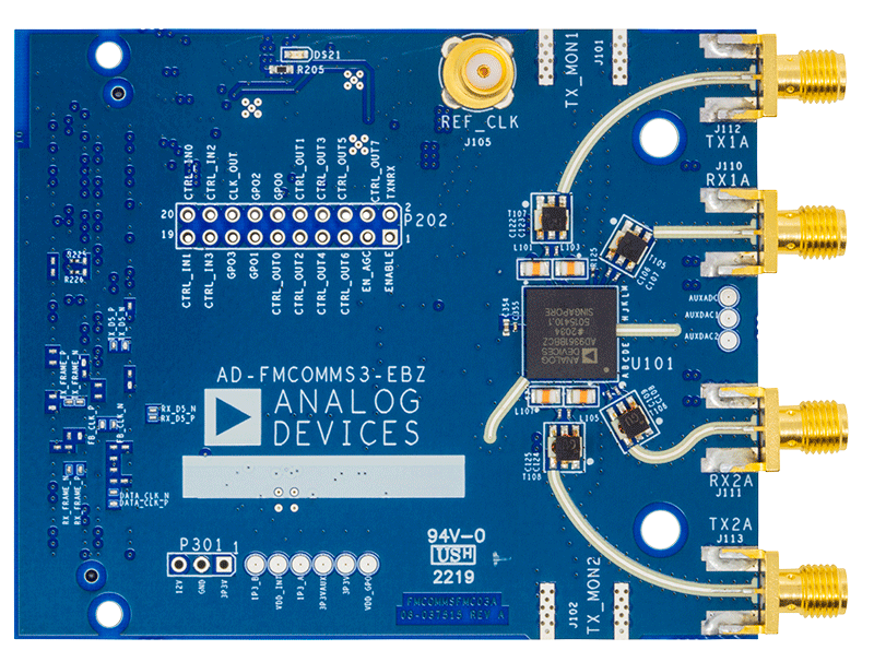 Analog Devices built the FMCOMMS family of evaluation boards around the AD9361 to provide a complete reference design. The boards handle power supply generation, clock distribution, antenna switching, and the high-speed digital interface to a host processor.