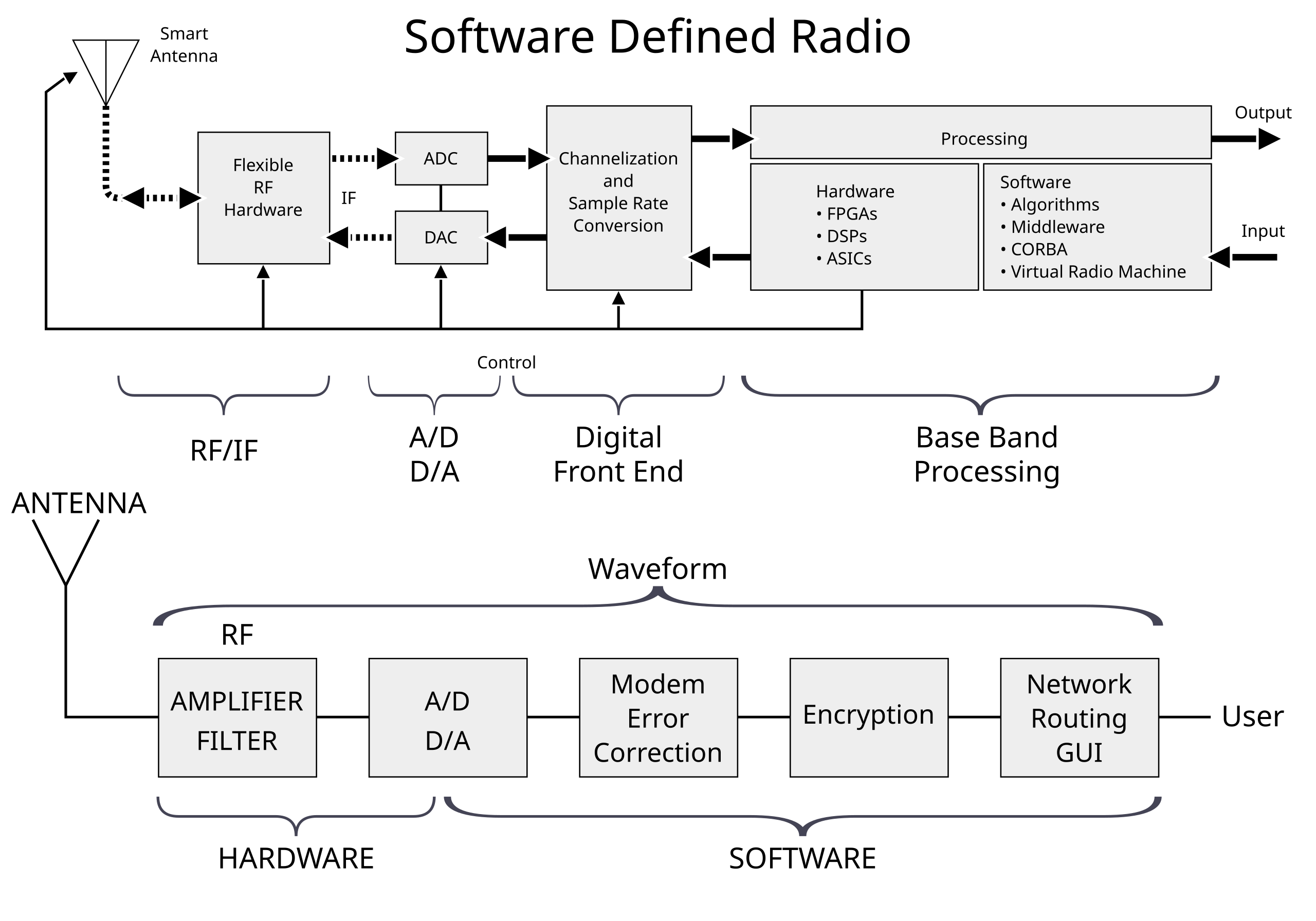 Traditional radio architectures lock most signal processing functions into hardware. A typical superheterodyne receiver uses fixed frequency oscillators, crystal filters, and dedicated mixer stages to down-convert RF signals to baseband. Changing the operating frequency or modulation scheme requires physically swapping components or switching between parallel signal chains. The result is inflexible hardware optimized for a narrow range of operating conditions.